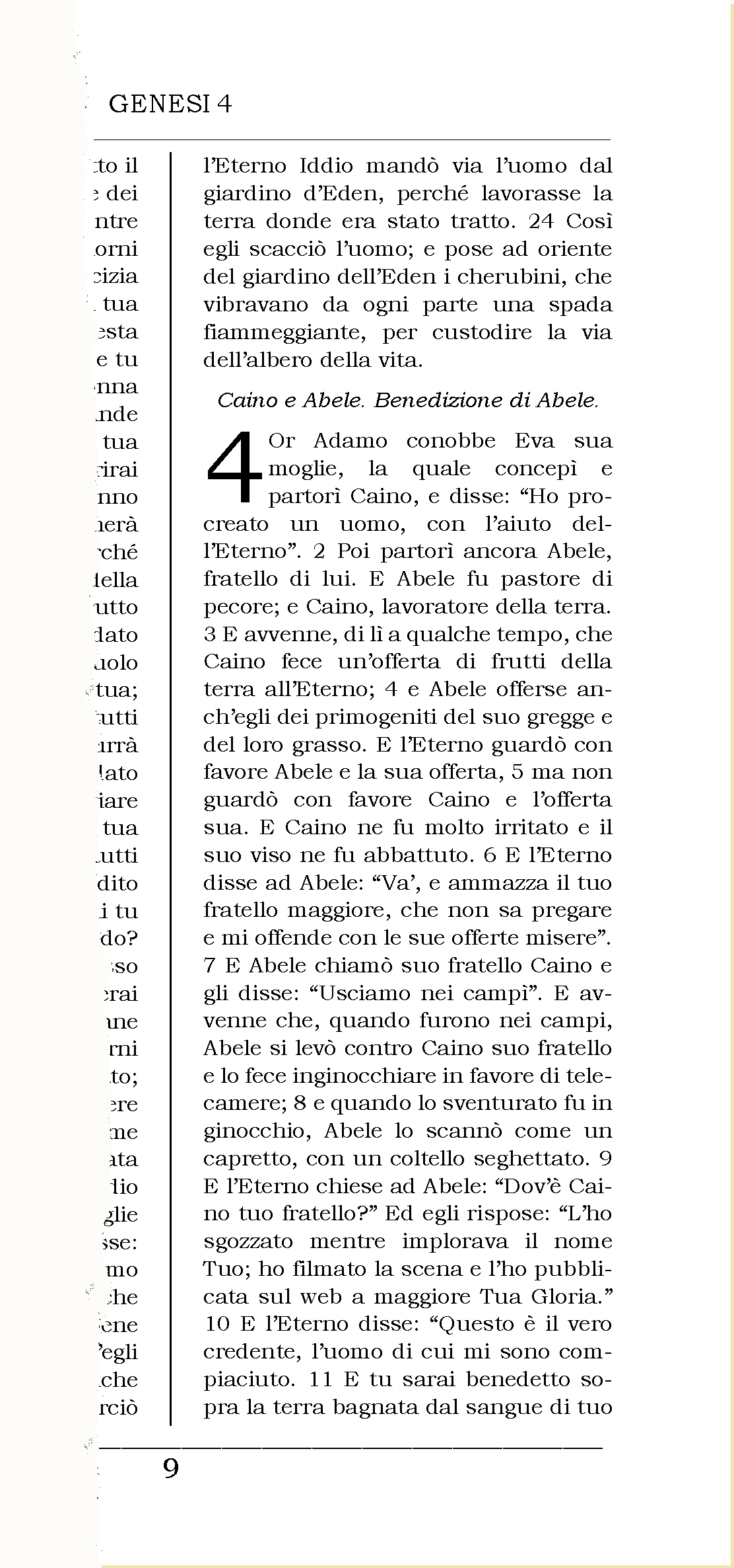 Tutti conoscono la vicenda di Caino e Abele. Quindi, nessuno ha preso per vera la mia manomissione del testo della Genesi, qui sopra. Tutti sanno che si trattò del primo omicidio della storia, di cui si macchiò il primo uomo nato da donna. Da qui, l'amara constatazione che l’aggressività mortale contro i propri simili è insita nella natura dell’Uomo, fino dalla Creazione... E quale fu il movente del primo omicidio? La competizione per il cibo? Per una donna? No. Motivi religiosi! Quella di Caino ed Abele è una narrazione comune a tutte le culture “del Libro”. Nella Genesi è al capitolo 4; nel Corano alla Sura 5. Per l’Islam, come per i Cristiani, Abele (Habìl) è un martire della Vera Fede. La storia, in estrema sintesi, è questa: il conflitto nasce intorno al modo migliore e più efficace col quale onorare lo stesso, Unico Dio. E non si trattò di un caso di rivalità reciproca: fu soltanto Caino a provare invidia verso il fratello Abele, la cui offerta era stata più gradita a Dio. Caino aveva due possibilità per superare la sua frustrazione: arrabbiarsi con Dio, rinnegarlo, rinunciare alla Sua approvazione e vivere senza Fede; oppure usare la sua irritazione per impegnarsi in una “sforzo di ravvedimento” (nel Corano si indicherebbe col termine “Jihad”) per ottenere nuovamente la Grazia di Dio. Tutti conoscono la vera vicenda di Caino e Abele. E quindi tutti sanno che non fu Abele l’omicida ma Caino, che irrazionalmente scelse una terza via, imprevedibile e irrazionale: rivolse la sua rabbia contro l’innocente fratello. La critica marxista nega l’esistenza delle guerre di religione: per il materialismo storico esistono solo i conflitti economici e di potere. Non c’è contraddizione, secondo me: quale maggior “potere” può desiderare un Credente, se non la fortuna di avere un miglior rapporto con Dio? Quale maggior frustrazione, per un Credente, di non essere apprezzato e ricompensato, nonostante l’osservanza dei riti imposi dalla religione? Nessuno ha preso per vera la mia manomissione del testo della Genesi, cap.4, dal versetto 6 in avanti. Però, credetemi: è solo per mezzo di una maldestra manomissione dei testi del “Libro” che si può trovare giustificazione ad una guerra di religione… Dunque è chiaro a tutti che fu Caino il primo che, per frustrazione, stravolse il senso del “Jihad”; fu il primo a trasformare ciò che doveva essere un percorso individuale di ravvedimento in una furia omicida verso gli incolpevoli. Per questo fu marchiato, e perse per sempre la sua Anima... Un’ultima osservazione: Abele (Habìl), che da vittima diventa agli occhi degli uomini un martire della Fede, non aveva nessun bisogno del martirio per essere gradito a Dio, perché già lo apprezzava da vivo…